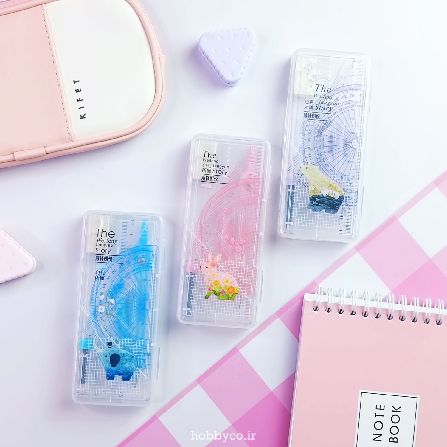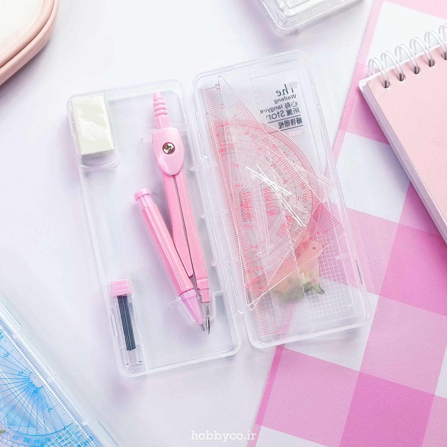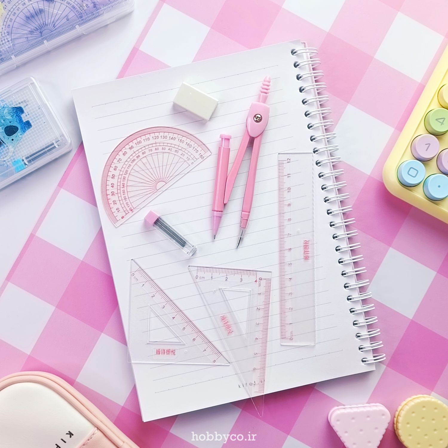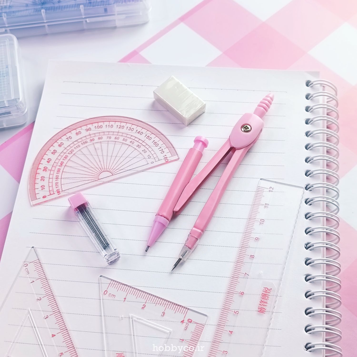 شامل یک پرگار، مغز اضافه پرگار، پاک کن، خط کش 12 سانتی، دو عدد گونیا ، یک نقاله